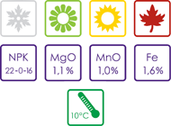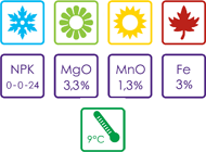 Toto organominerální hnojivo zajišťuje rostlinám vyšší odolnost vůči mrazu, suchu, nemocem a intenzivnímu použití během zimních období. Draslík zpevňuje buněčné stěny a přidané aminokyseliny zajišťují dobrou dostupnost živin i během nízkých teplot.