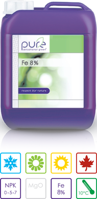 Fe 8 % je navrženo jako doplňkový produkt v případě symptomů nedostatků. Nová polymerní vazba spolu s fosforem a draslíkem umožňuje aplikovat vyšší dávky živin bez nebezpečí popálení.